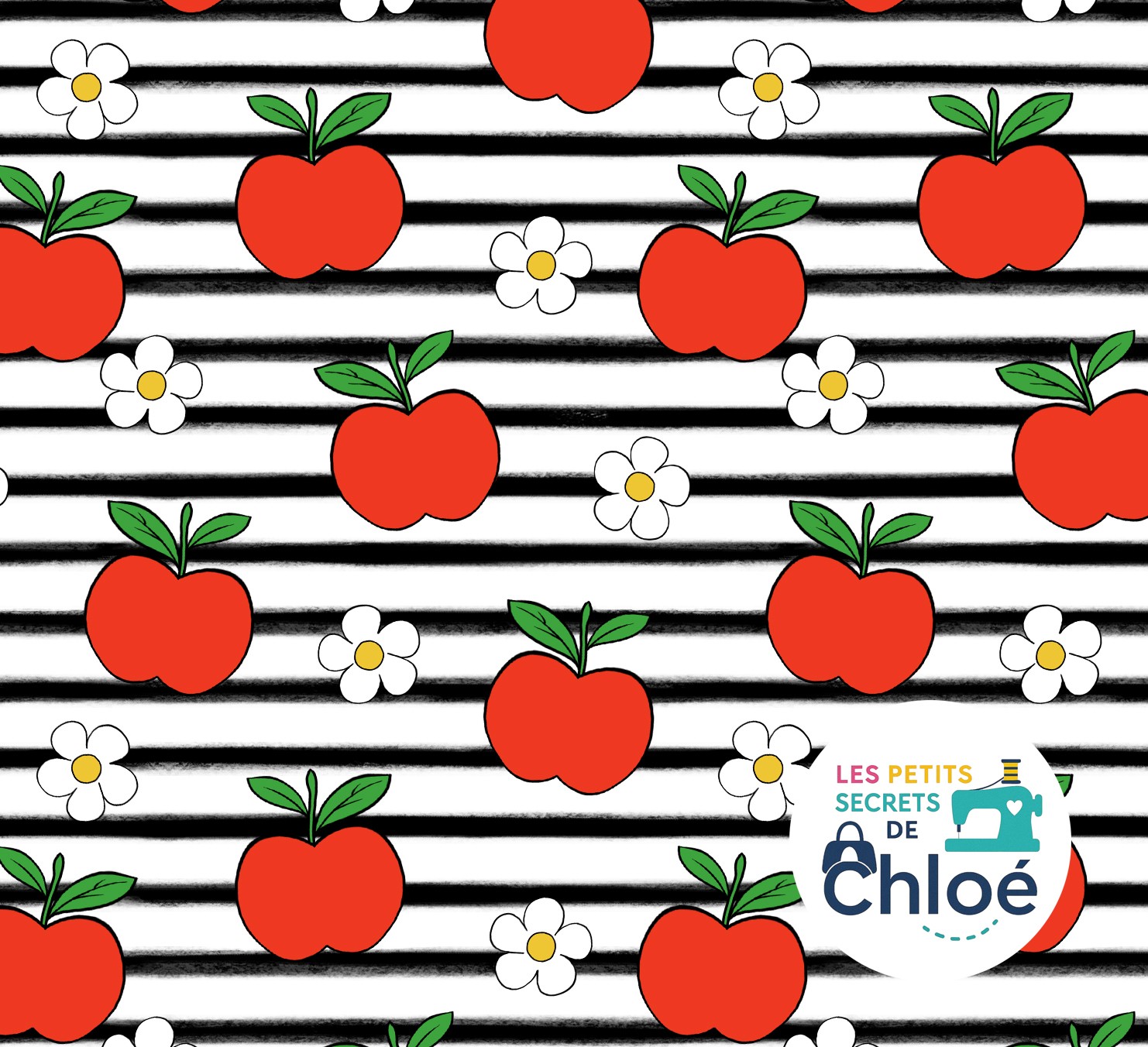 Un tissu vitaminé et plein de pep's ! Ses pommes rouges craquantes et ses marguerites blanches s'épanouissent sur un fond à rayures noires et blanches pour un rendu graphique, fun et ultra tendance. Idéal pour vos sacs, pochettes, accessoires ou créations couture originales.