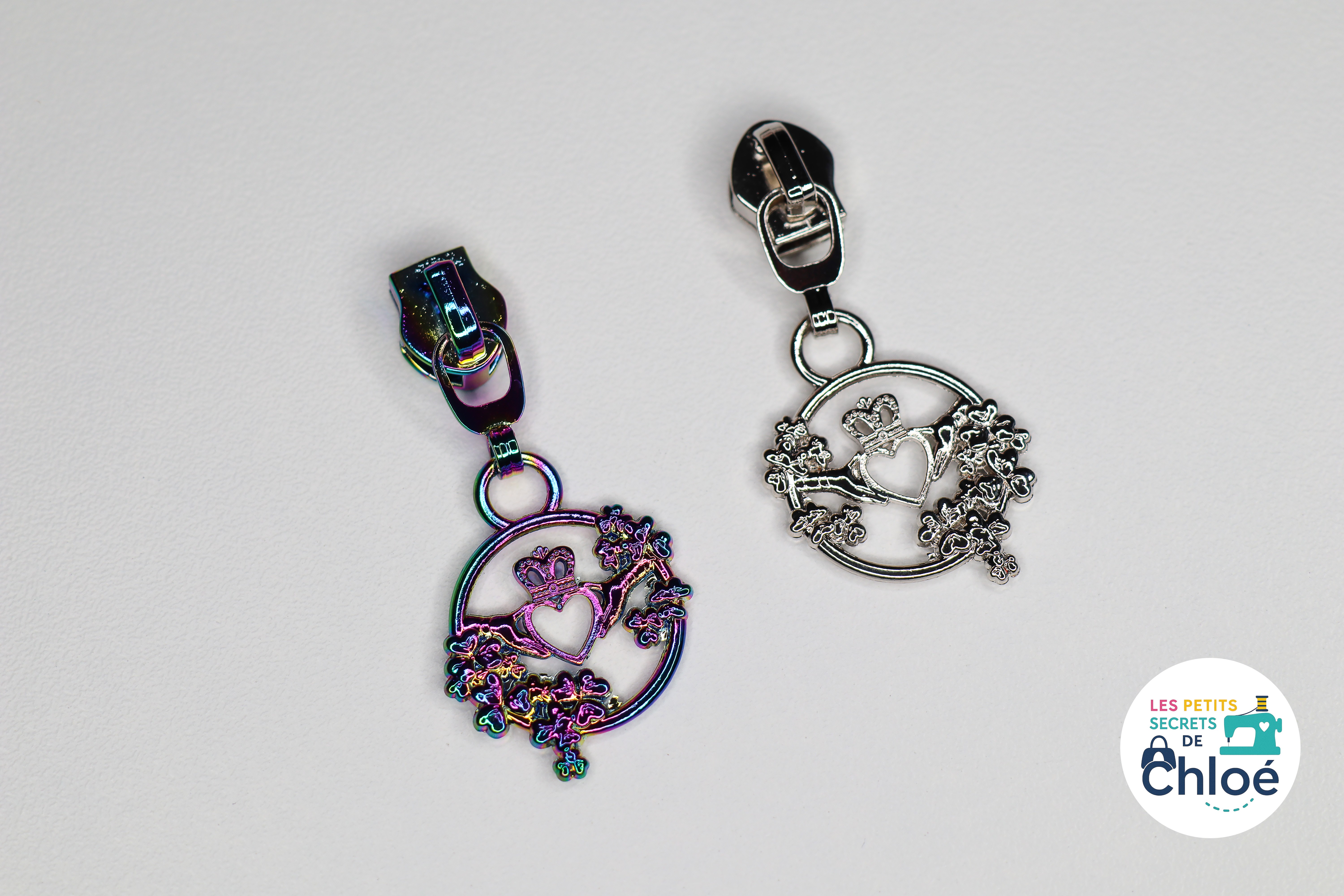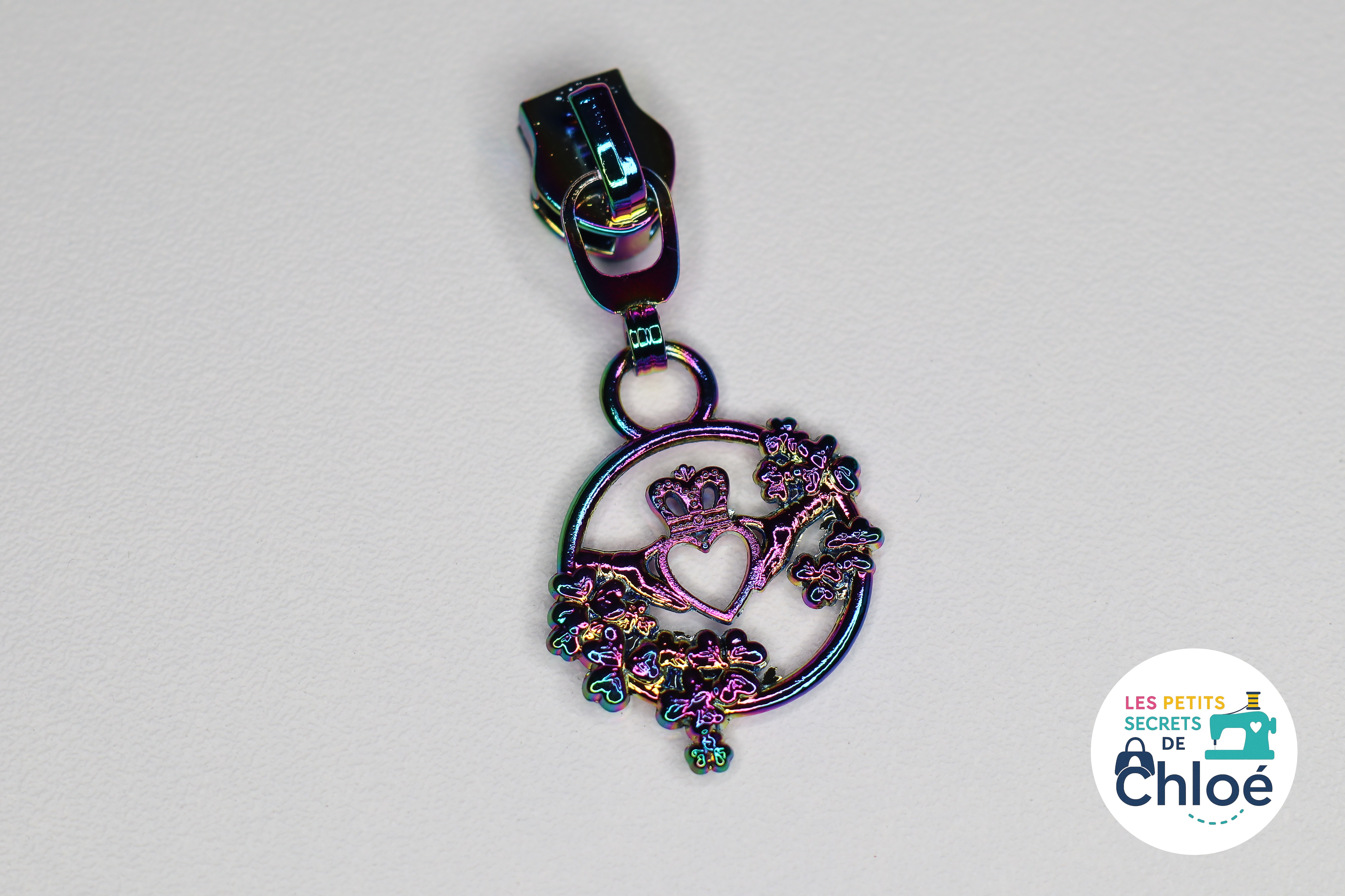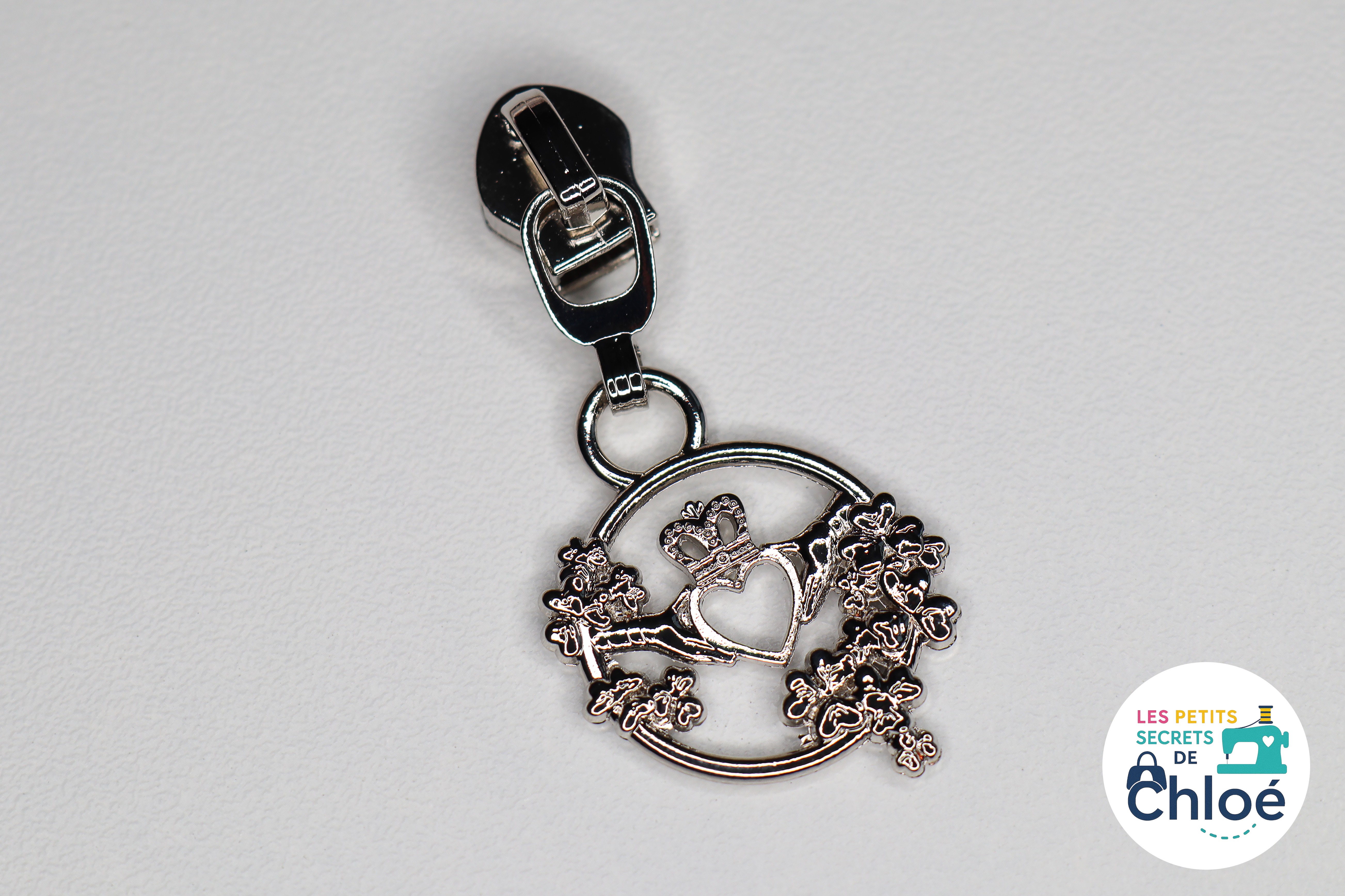 Curseur métallique décoratif en forme de mains tenant un coeur couronné, entourées de fleurs.