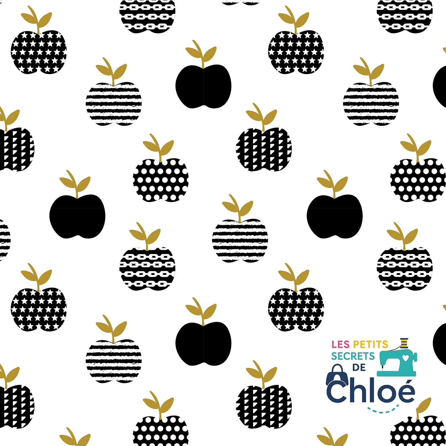 Découvrez "Pomme Chic", un motif chic et audacieux qui marie à merveille le noir profond, le blanc éclatant et une touche de couleur dorée. Ses pommes graphiques, déclinées en rayures, pois et étoiles, apporteront une note moderne et élégante à vos créations. 🍏✨