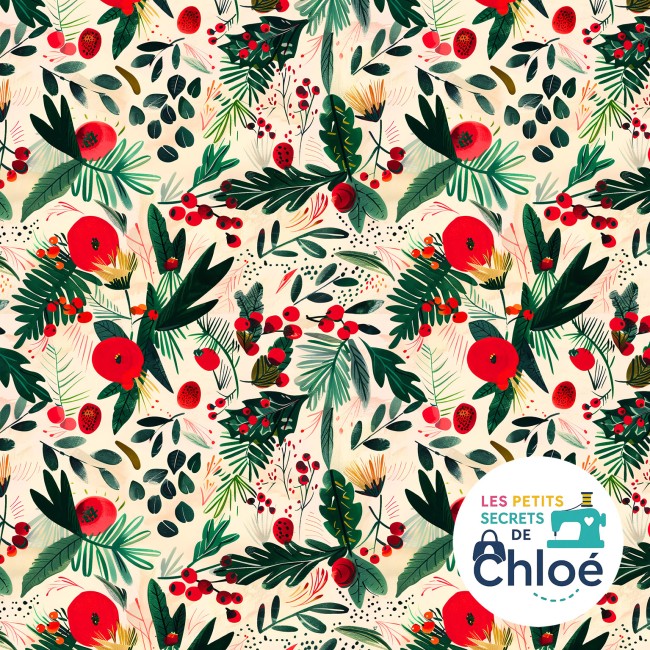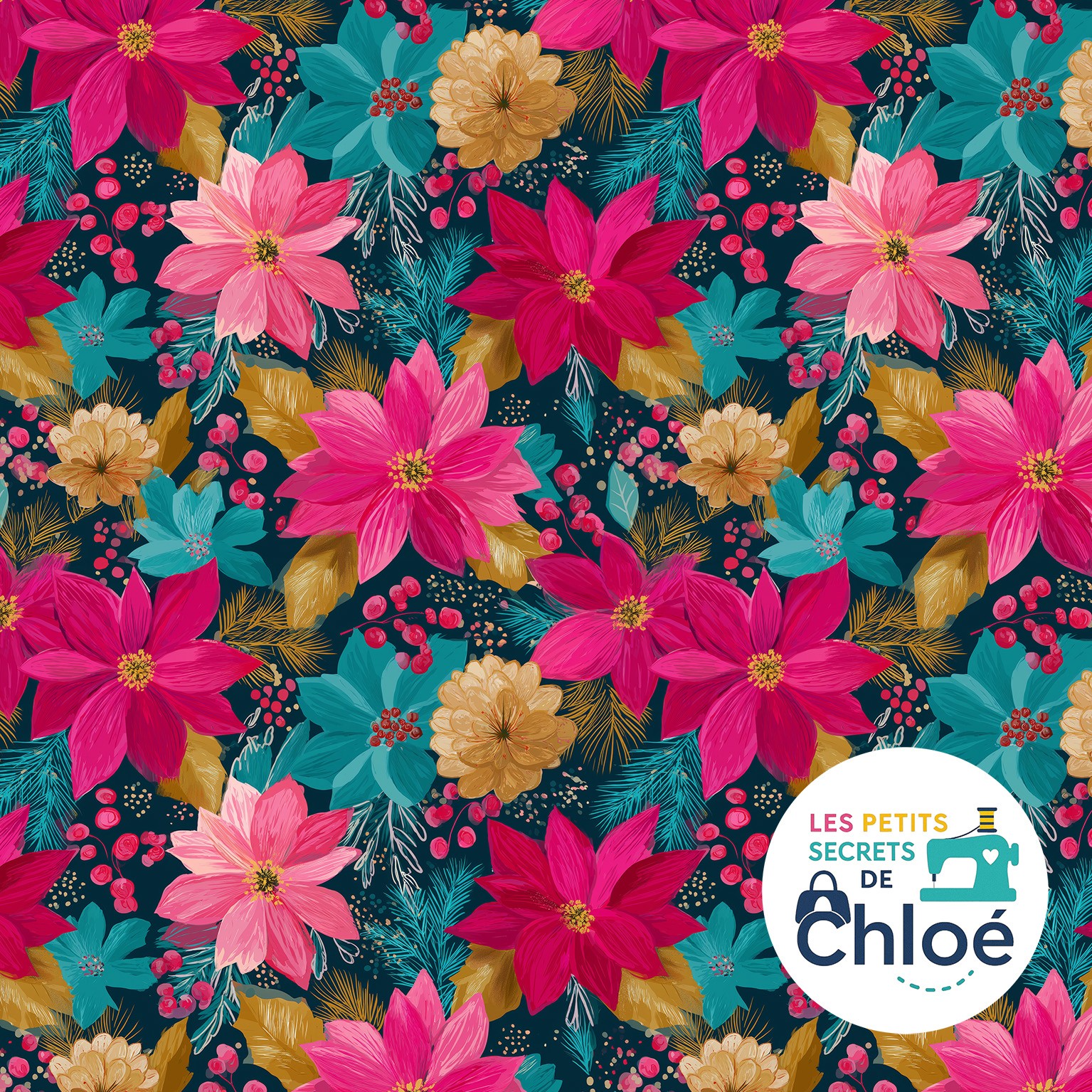 Un motif somptueux où les poinsettias flamboyants, les branches dorées et les touches turquoise s'entremêlent sur un fond profond, évoquant la magie et la chaleur des fêtes. 🌸