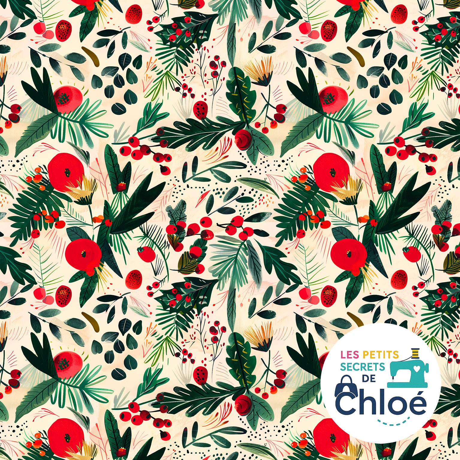 Entre baies rouges éclatantes, feuillages d'hiver et touches dorées, ce motif évoque la beauté naturelle des fêtes dans une atmosphère chaleureuse et lumineuse.
