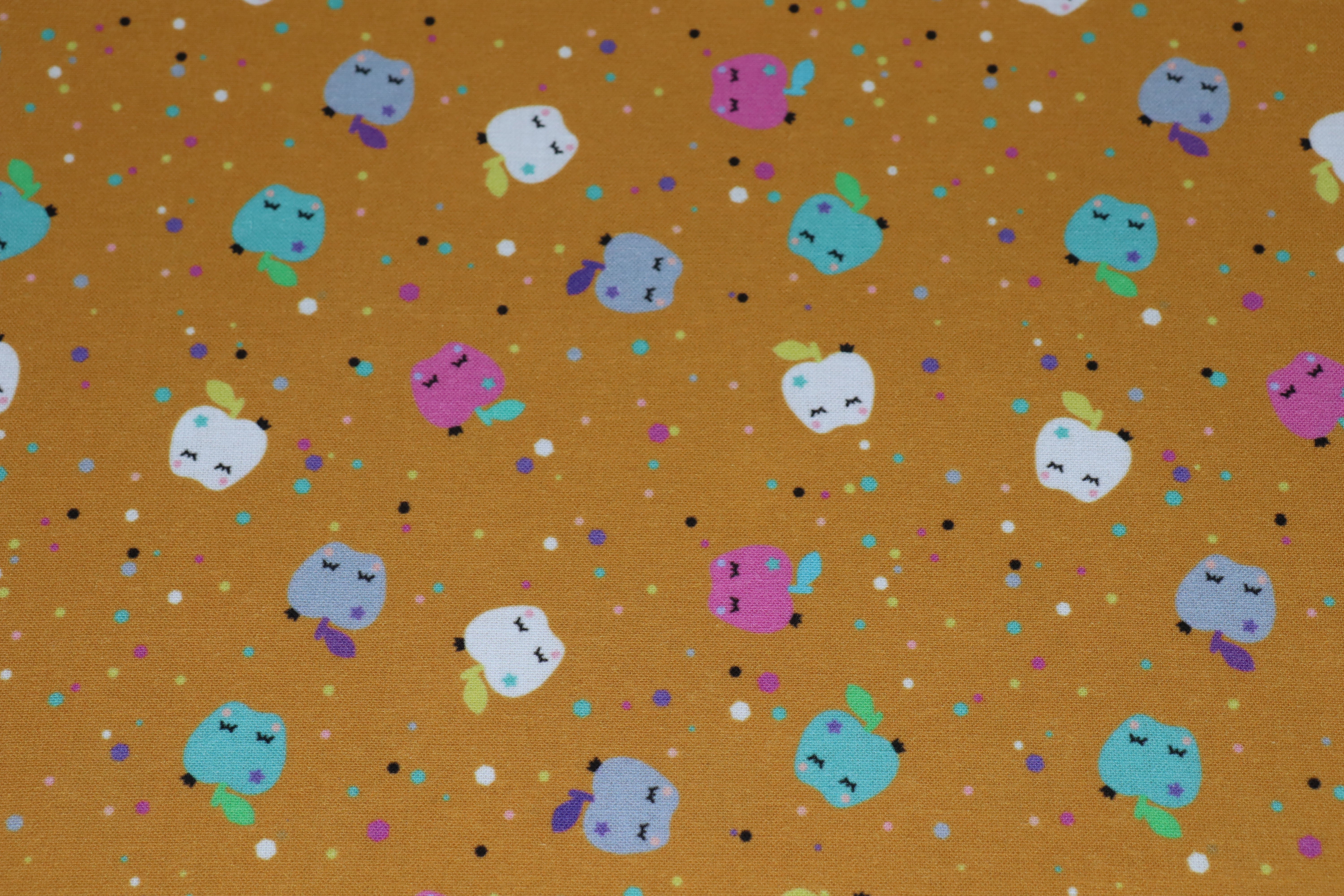 Plein de douceur et de fantaisie, Pom'Party est un motif de José pour Les Petits Secrets De Chloé. De petites pommes aux couleurs tendres se dispersent sur un fond moutarde chaleureux, ponctué de confettis graphiques qui apportent une touche joyeuse et ludique.