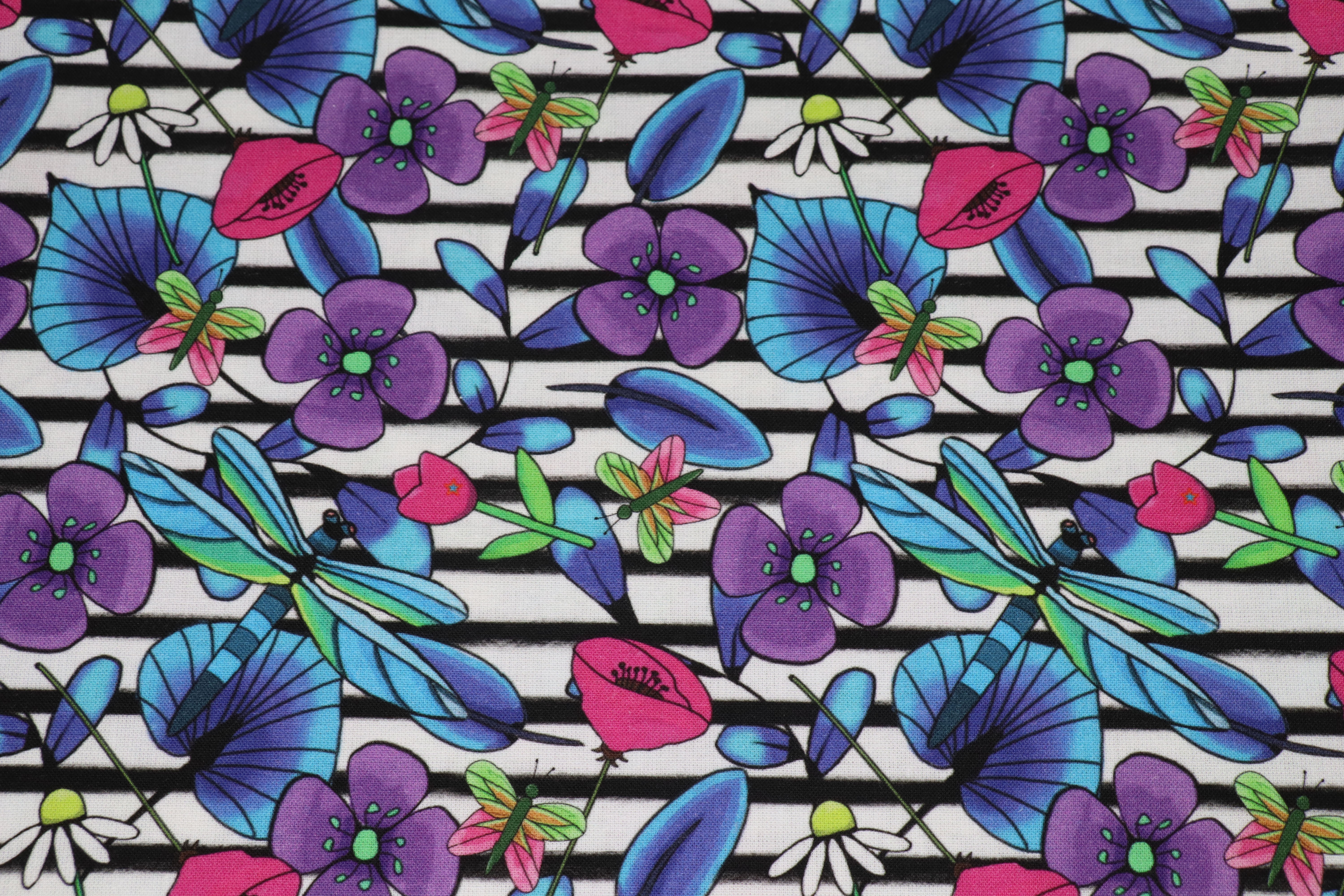 Audacieux et résolument graphique, Floraison Graphique est un motif de José pour Les Petits Secrets De Chloé. Des fleurs vibrantes et des libellules délicates s'entrelacent sur un fond rayé noir et blanc, créant un contraste fort et une identité visuelle unique.