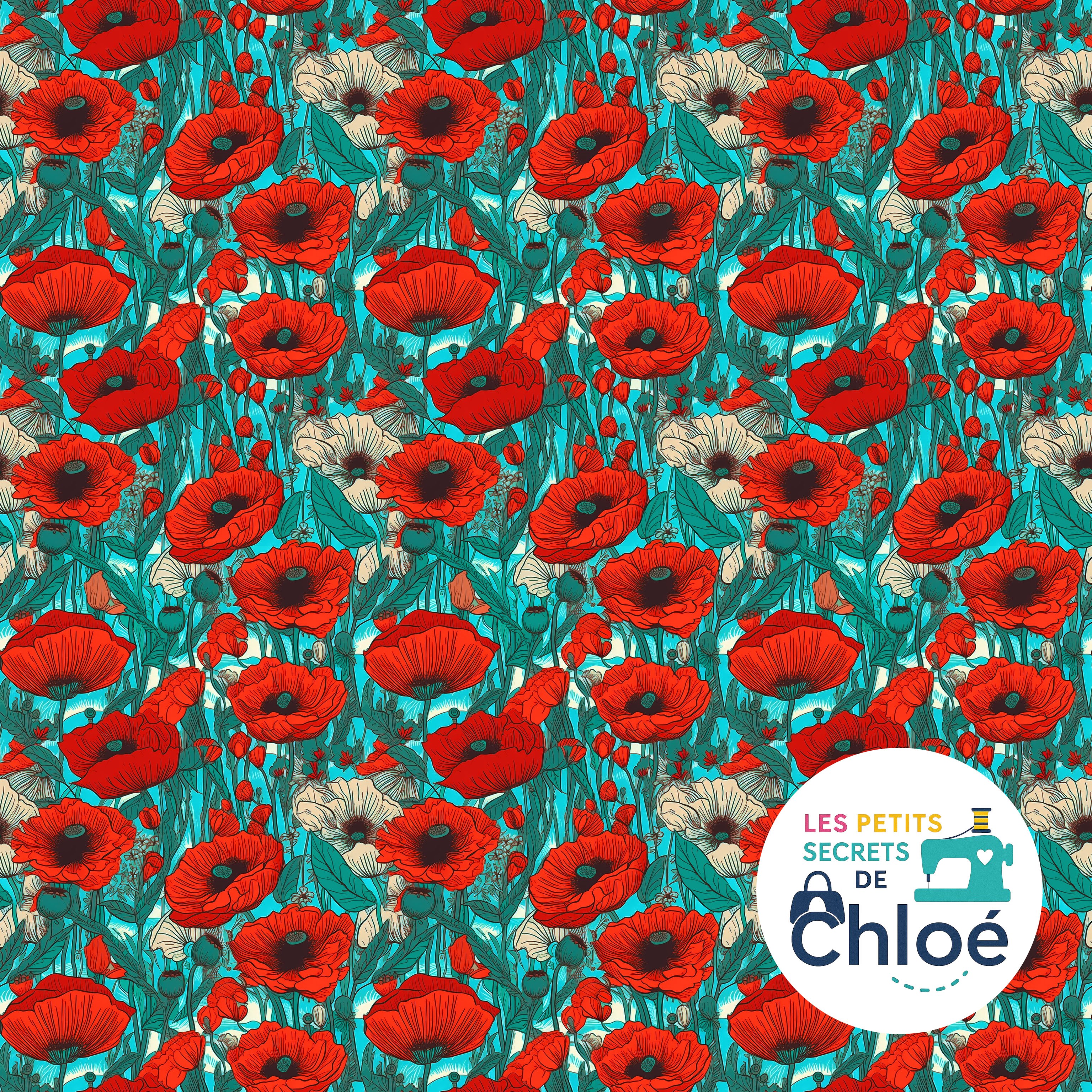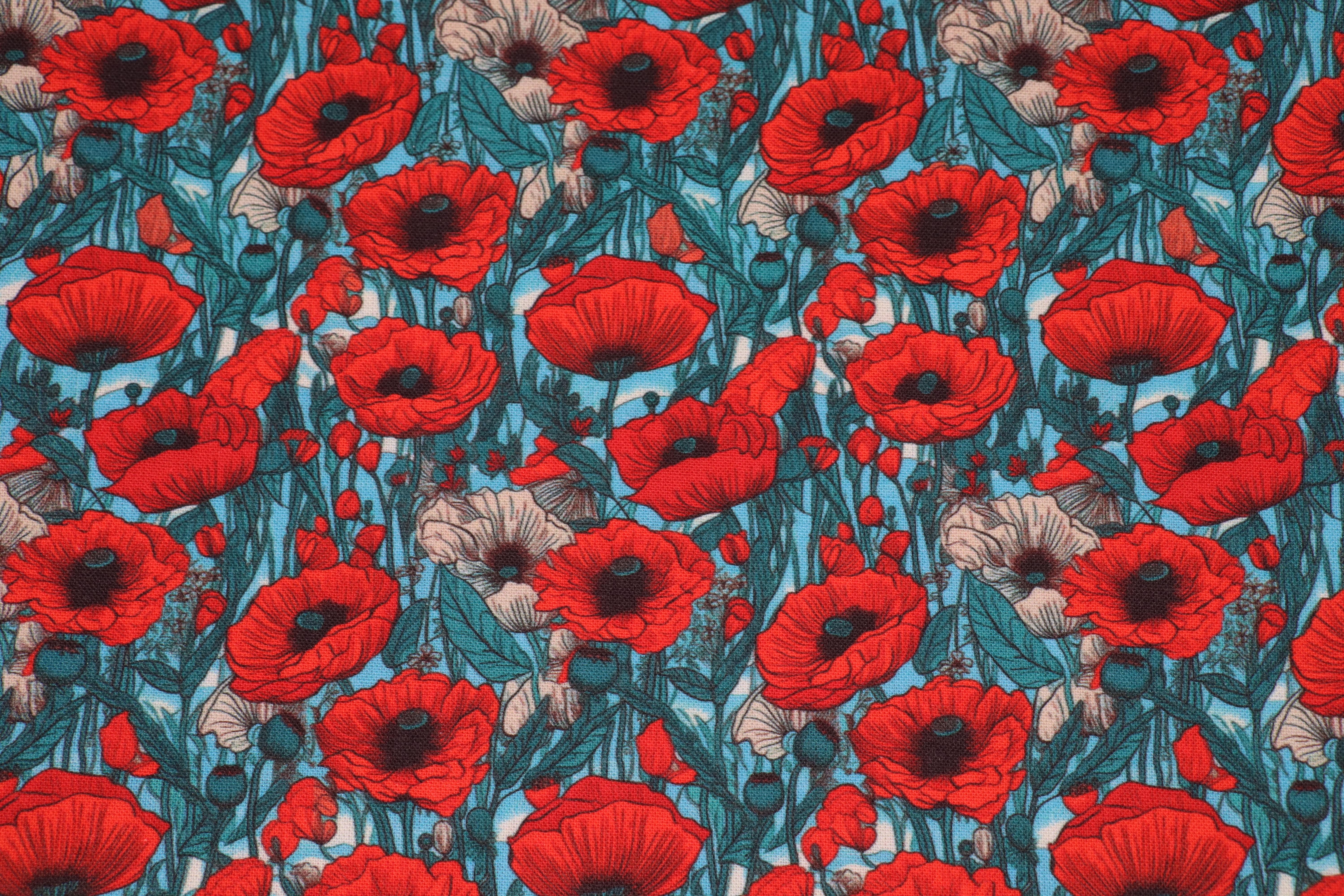 Intense et raffiné, Coquelicots Sauvages est un tissu designer aux fleurs rouges éclatantes, contrastant magnifiquement avec un fond aux nuances vertes et bleutées. Ce motif floral riche et détaillé évoque la force et la délicatesse des champs de coquelicots, apportant une véritable présence visuelle à vos créations couture.