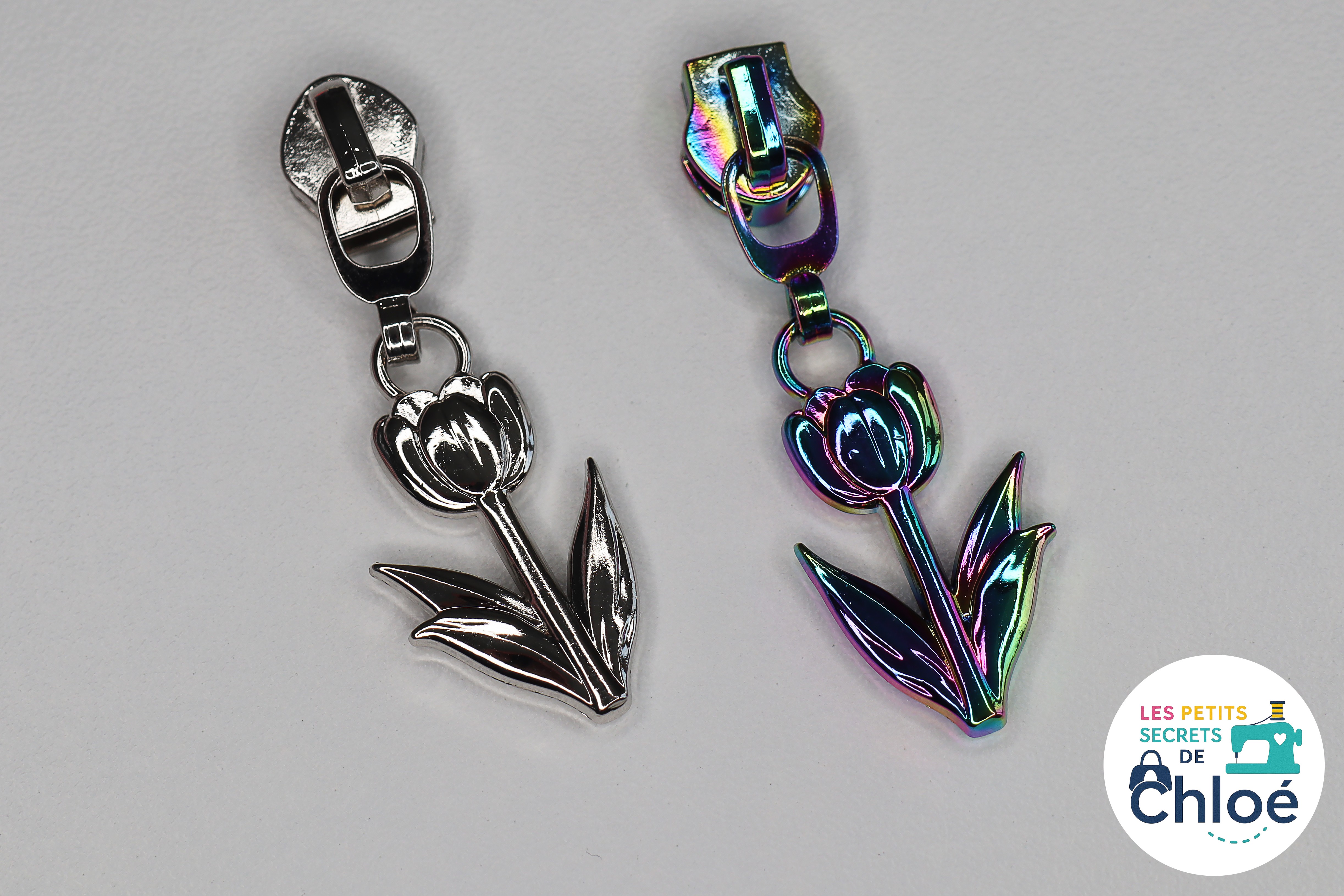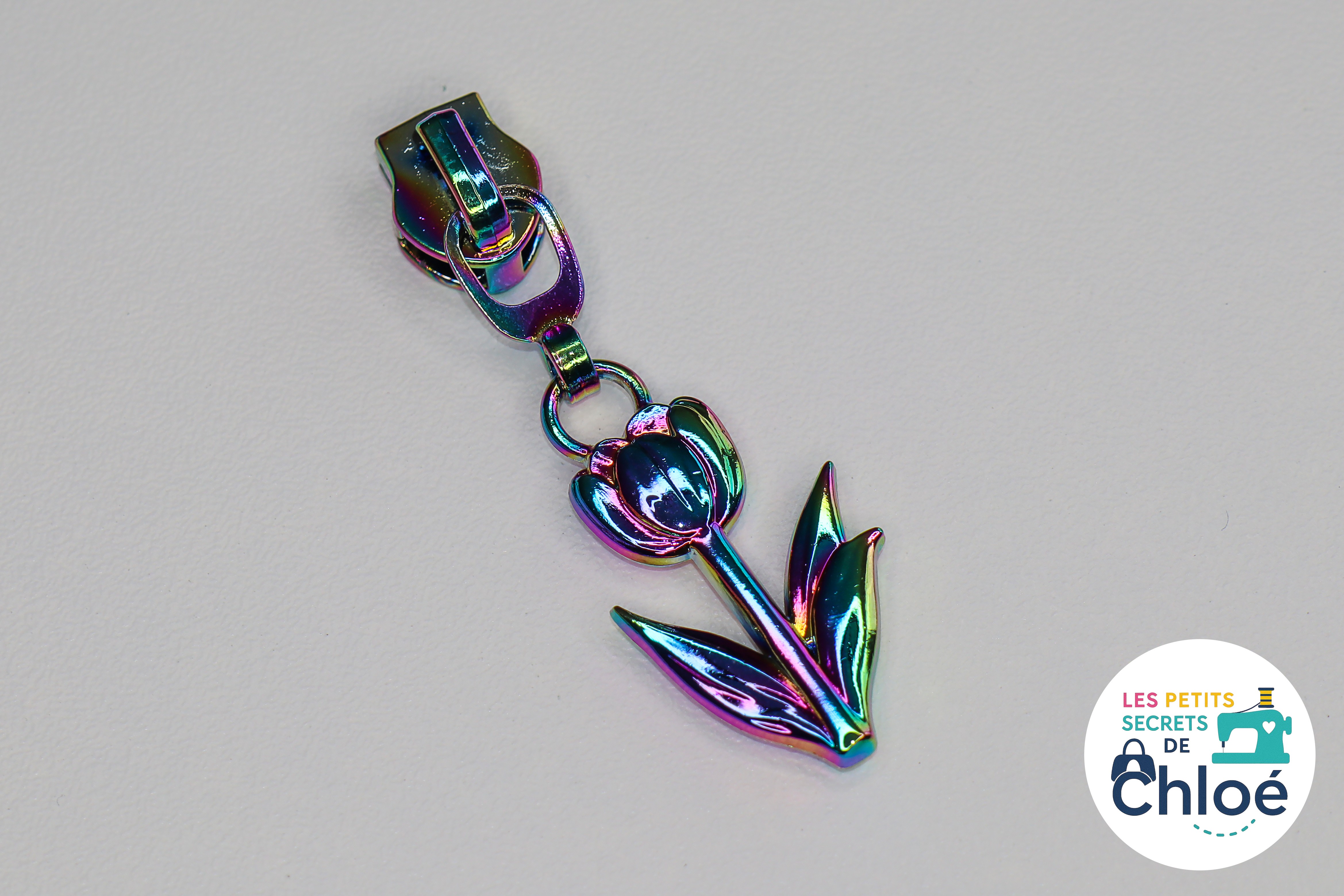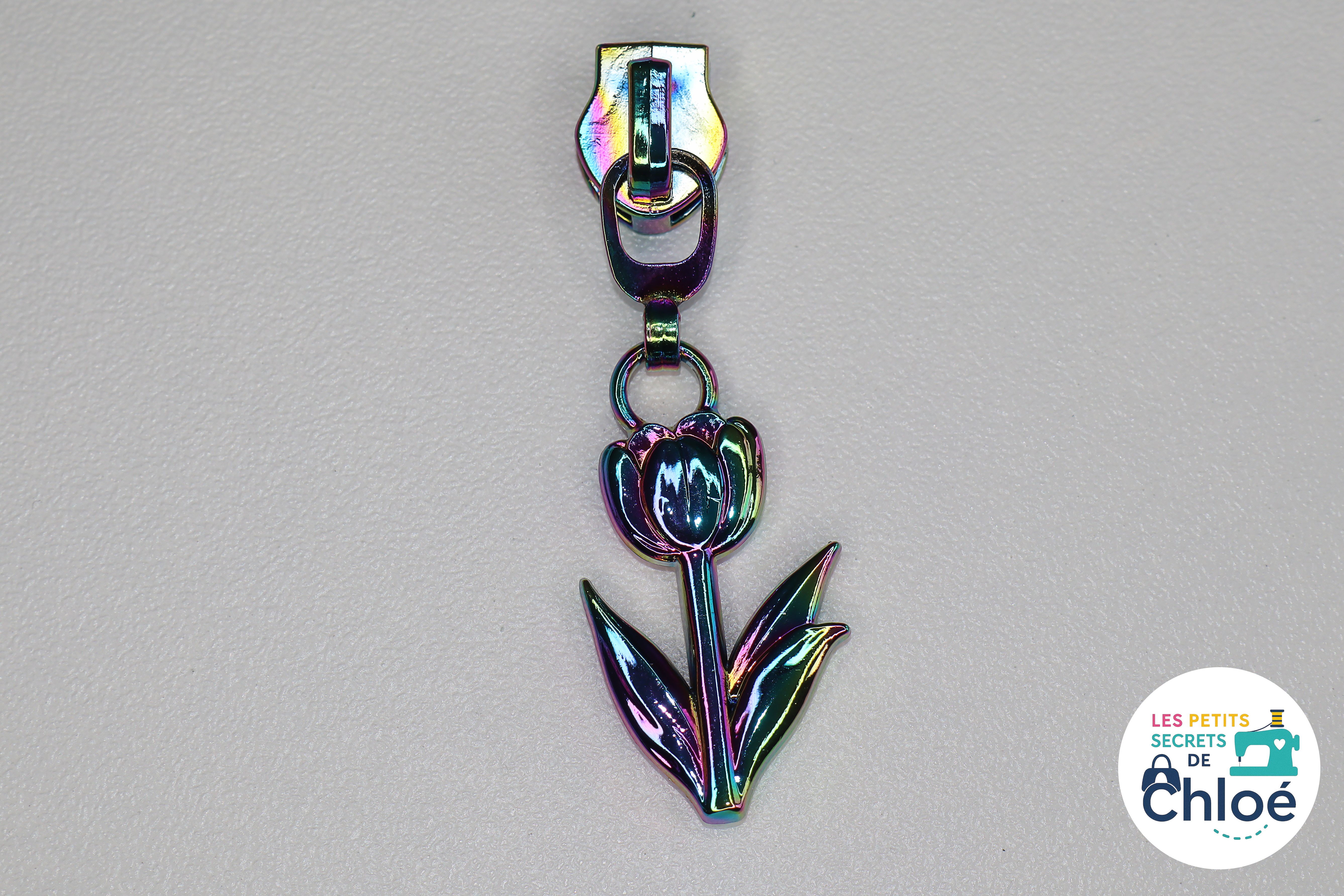 Curseur métallique décoratif en forme de tulipe.